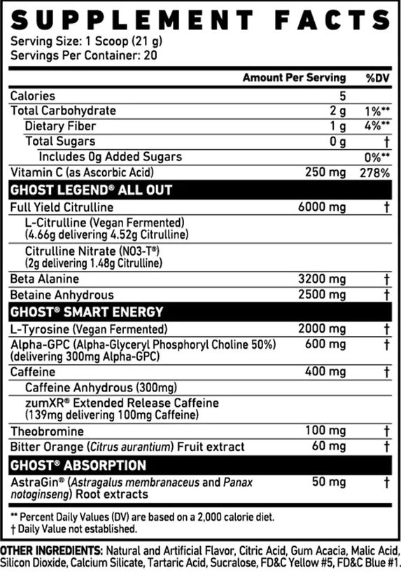 One of the key features of Ghost Legend All Out is its high caffeine content. With a total of 400 mg of caffeine, it provides a significant energy kick. This caffeine dosage is split between two forms: Anhydrous (300mg) and zumXR (100mg). The combination ensures that users experience both immediate and sustained energy release.